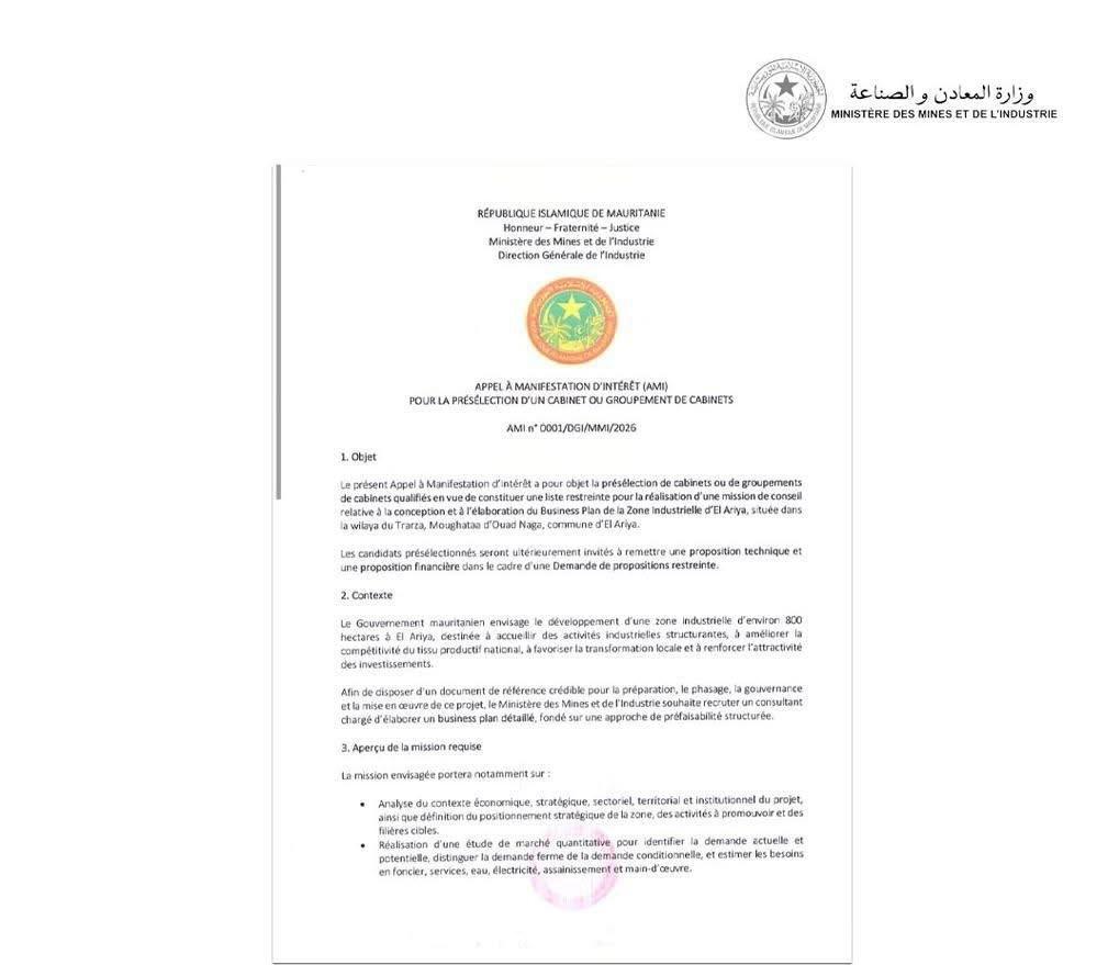 أعلنت وزارة المعادن والصناعة الموريتانية عبر المديرية العامة للصناعة عن إطلاق دعوة دولية لإبداء الاهتمام (AMI) رقم 0001/DGI/MMI/2026، وذلك في إطار التحضير لإنشاء منطقة صناعية استراتيجية بمنطقة العرية في ولاية الترارزة.