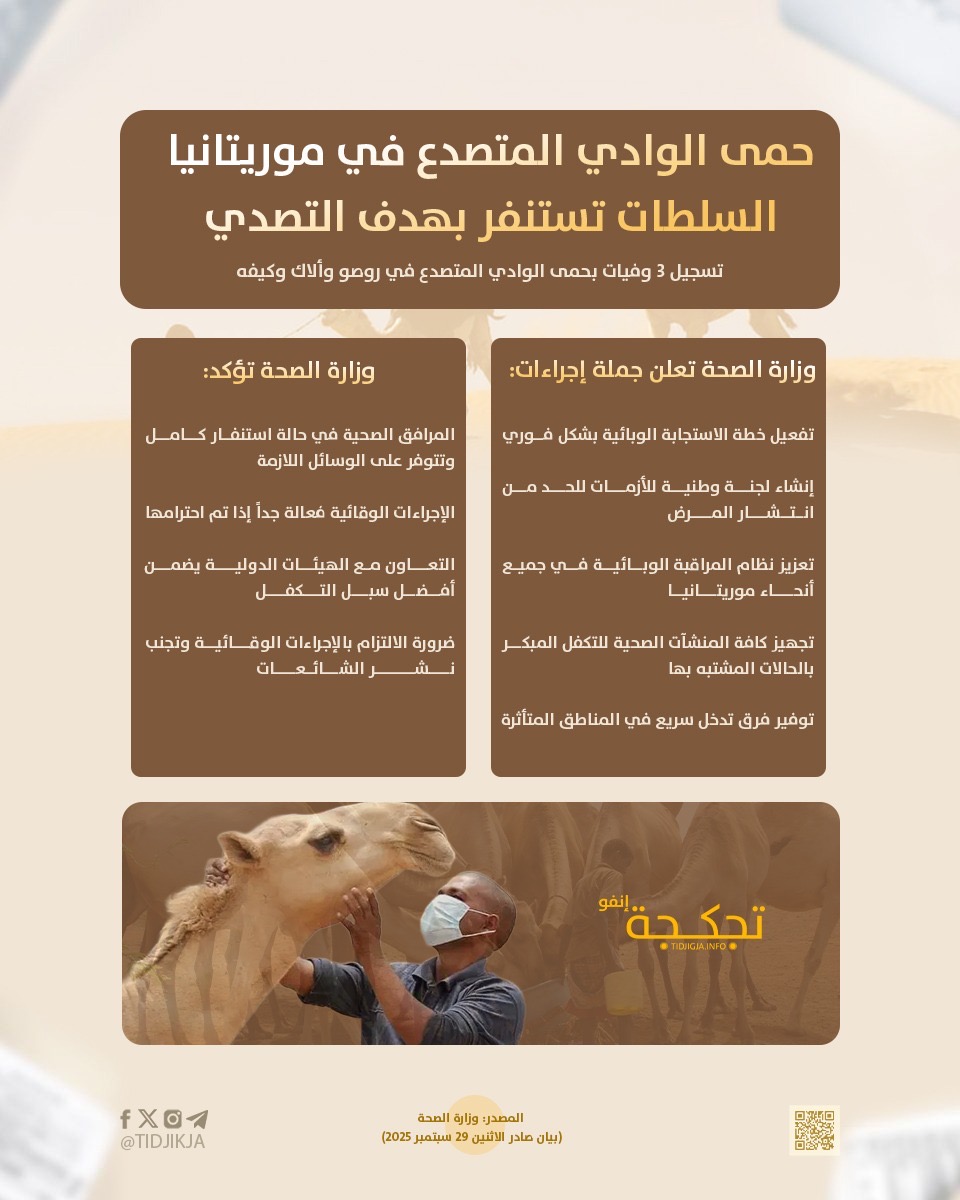 سجلت موريتانيا ثلاث حالات وفاة نتيجة حمى الوادي المتصدع، ما دفع وزارة الصحة إلى إعلان حالة استنفار على مستوى جميع المنشآت الصحية في البلاد.