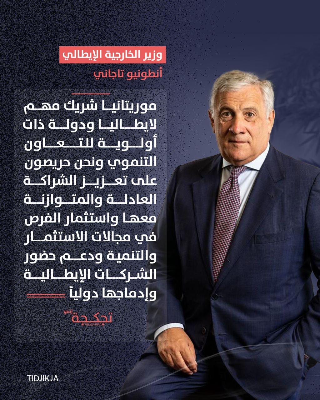 قال وزير الخارجية الإيطالي، أنطونيو تاجاني إن موريتانيا شريك مهم لإيطاليا ودولة ذات أولوية للتعاون التنموي.