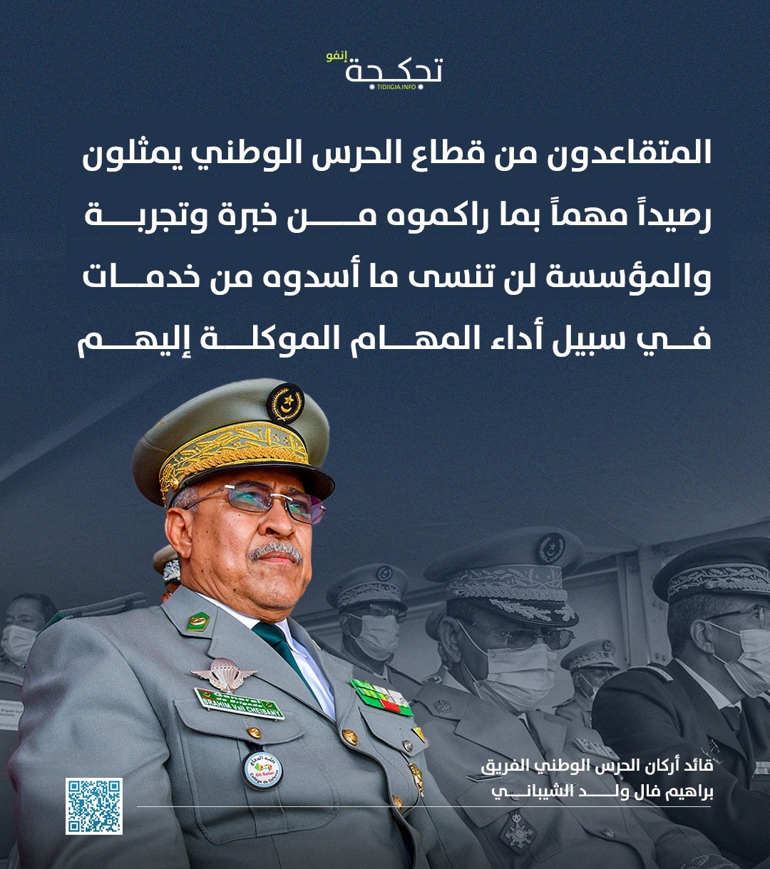 قال قائد أركان الحرس الوطني الفريق إبراهيم فال ولد الشيباني إن المتقاعدين من قطاع الحرس الوطني يمثلون رصيداً مهماً بما راكموه من خبرة وتجربة.