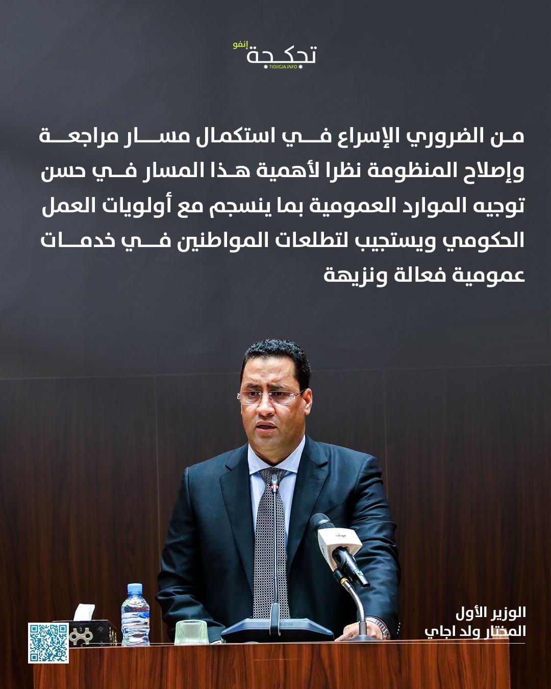 أكد الوزير الأول المختار ولد أجاي ضرورة الإسراع في استكمال مراجعة وإصلاح منظومة الصفقات العمومية، لما لذلك من أهمية في حسن توجيه الموارد العمومية، بما ينسجم مع أولويات العمل الحكومي ويستجيب لتطلعات المواطنين في خدمات عمومية فعالة ونزيهة.