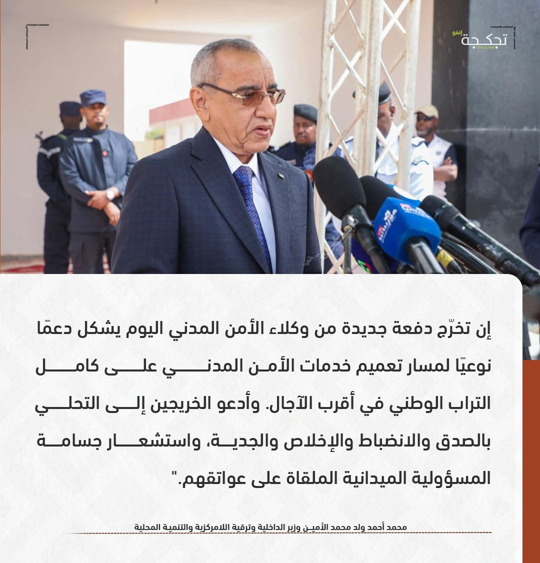 “إن تخرّج دفعة جديدة من وكلاء الأمن المدني اليوم يشكل دعمًا نوعيًا لمسار تعميم خدمات الأمن المدني على كامل التراب الوطني في أقرب الآجال. وأدعو الخريجين إلى التحلي بالصدق والانضباط والإخلاص والجدية، واستشعار جسامة المسؤولية الميدانية الملقاة على عواتقهم."