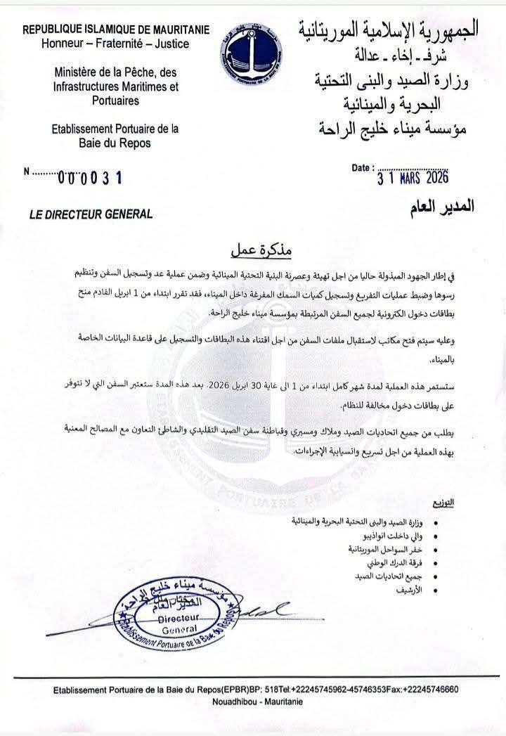 وجاء في مذكرة صادرة اليوم الثلاثاء عن المدير العام للمؤسسة، مختار ملل جا، إن الخطوة تشمل اعتماد بطاقات دخول إلكترونية لفائدة جميع السفن المرتبطة بالميناء، ابتداءً من فاتح أبريل المقبل، وذلك بهدف ضبط عمليات التفريغ وتسجيل كميات الأسماك المفرغة داخل الحوض المينائي.