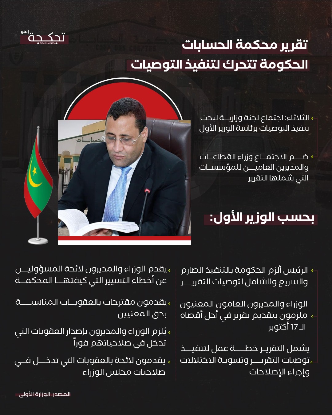 وطلب الوزير الأول من الوزراء والمديرين تقديم لوائح بأسماء المسؤولين عن أخطاء التسيير التي كيفتها المحكمة، واقتراح العقوبات المناسبة بحقهم، مشدداً على ضرورة إصدار العقوبات التي تدخل في صلاحياتهم فوراً، وإحالة العقوبات التي تتطلب قراراً من مجلس الوزراء إلى الحكومة للنظر فيها.