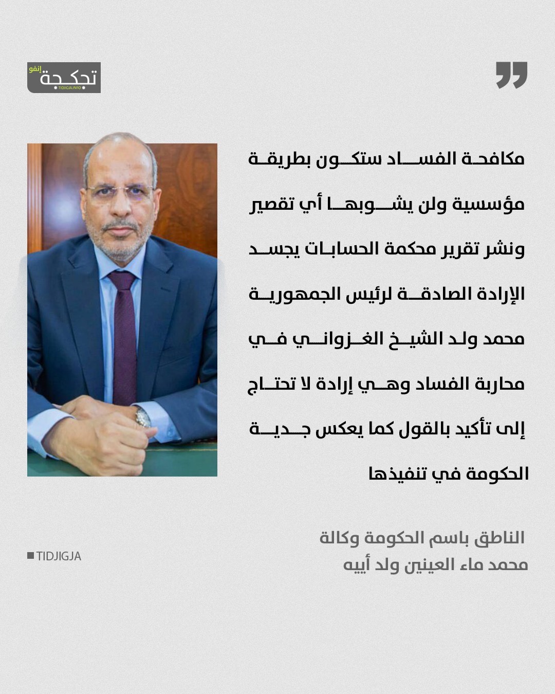 وأشار ولد أييه، خلال المؤتمر الصحفي للحكومة مساء الأربعاء، إلى أن نشر تقارير محكمة الحسابات يعكس الإرادة الصادقة للرئيس محمد ولد الشيخ الغزواني في محاربة الفساد، وهي إرادة لا تحتاج إلى تأكيد بالقول، كما تجسد جدية الحكومة في متابعة هذا الملف.