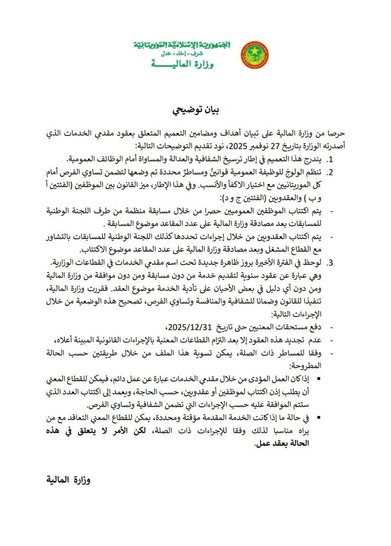 قالت وزارة المالية إن التعميم الذي أصدرته والمتعلق بعقود مقدمي الخدمات هدفه ترسيخ الشفافية والعدالة والمساواة أمام الوظائف العمومية.