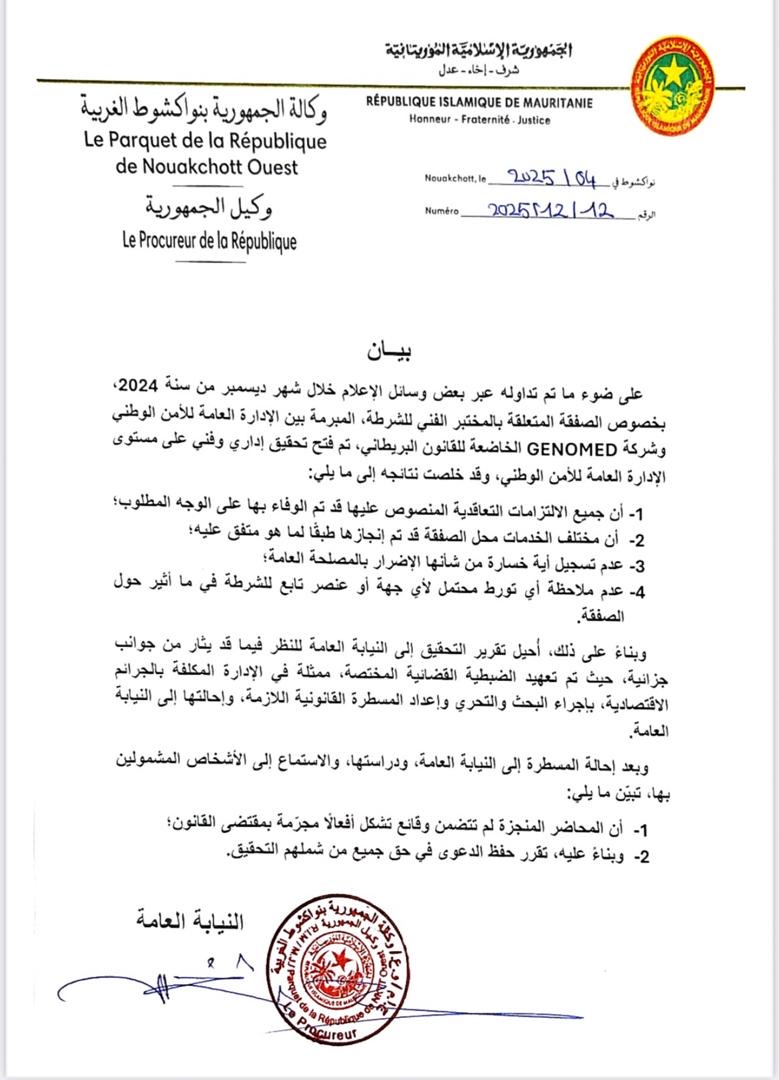 أعلنت السلطات، اليوم الجمعة، حفظ الدعوى في حق جميع المشمولين في ملف الصفقة المتعلقة بالمختبر الفني للشرطة، وذلك بعد اكتمال مسار التحقيق الإداري والفني والقضائي حول الموضوع.