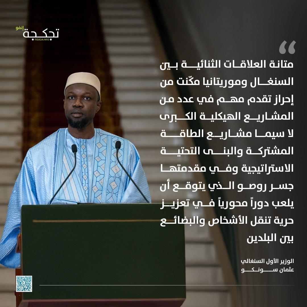 أكد الوزير الأول السنغالي عثمان سونكو، أن متانة العلاقات الثنائية بين السنغال وموريتانيا مكّنت من إحراز تقدم مهم في عدد من المشاريع الهيكلية الكبرى، ولا سيما مشاريع الطاقة المشتركة والبنى التحتية الاستراتيجية.