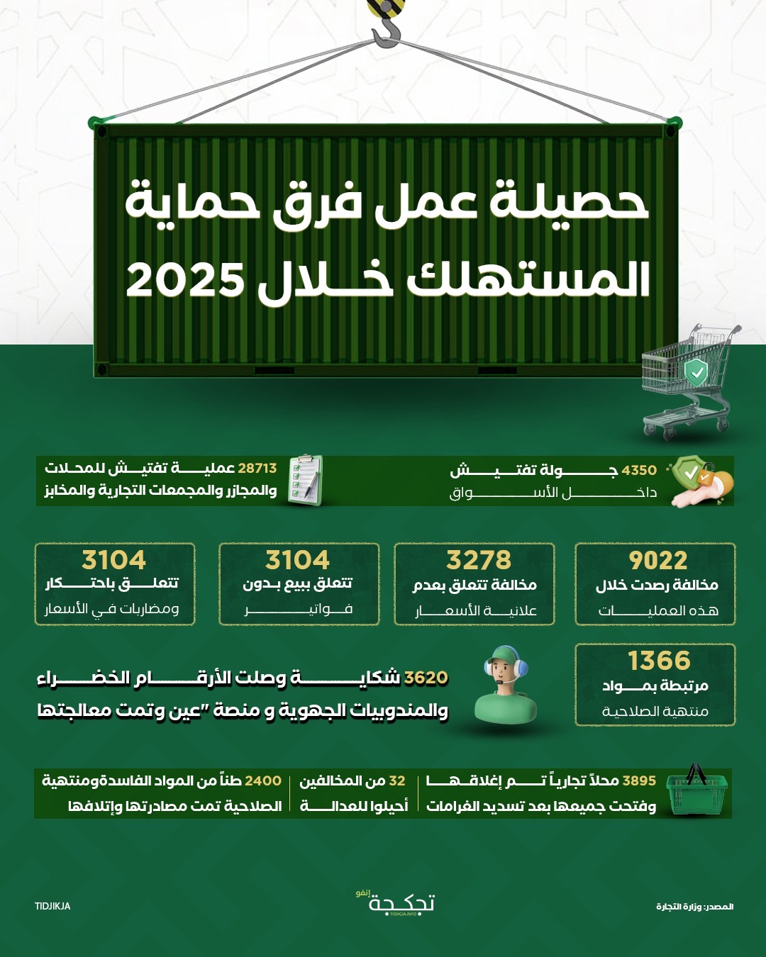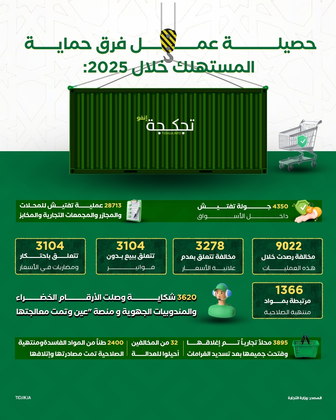 ووفق معطيات الوزارة؛ نفذت فرق حماية المستهلك 4350 جولة تفتيش داخل الأسواق، شملت 28713 عملية تفتيش للمحلات والمجازر والمجمعات التجارية والمخابز، وأسفرت عن رصد 9022 مخالفة.