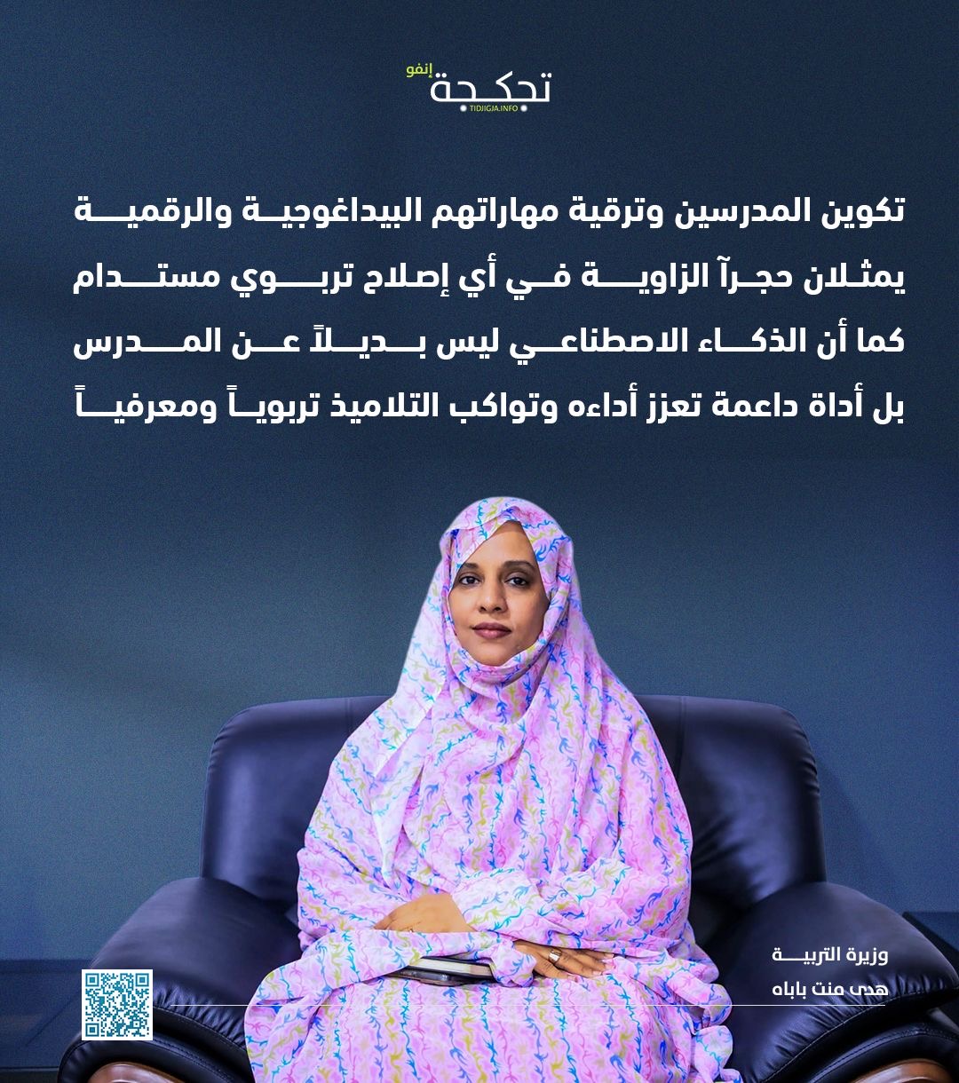 جاء حديث الوزيرة، اليوم الثلاثاء، في العاصمة نواكشوط، خلال إطلاق الإطار الوطني "الذكاء الاصطناعي في خدمة المدرسة الجمهورية".