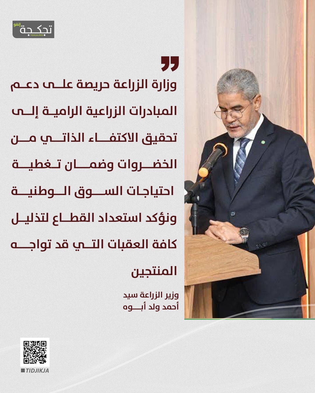 أكد وزير الزراعة سيد أحمد ولد أبوه حرص القطاع على دعم كافة المبادرات الزراعية الهادفة إلى تحقيق الاكتفاء الذاتي من الخضروات وضمان تغطية احتياجات السوق الوطنية بشكل مستدام.