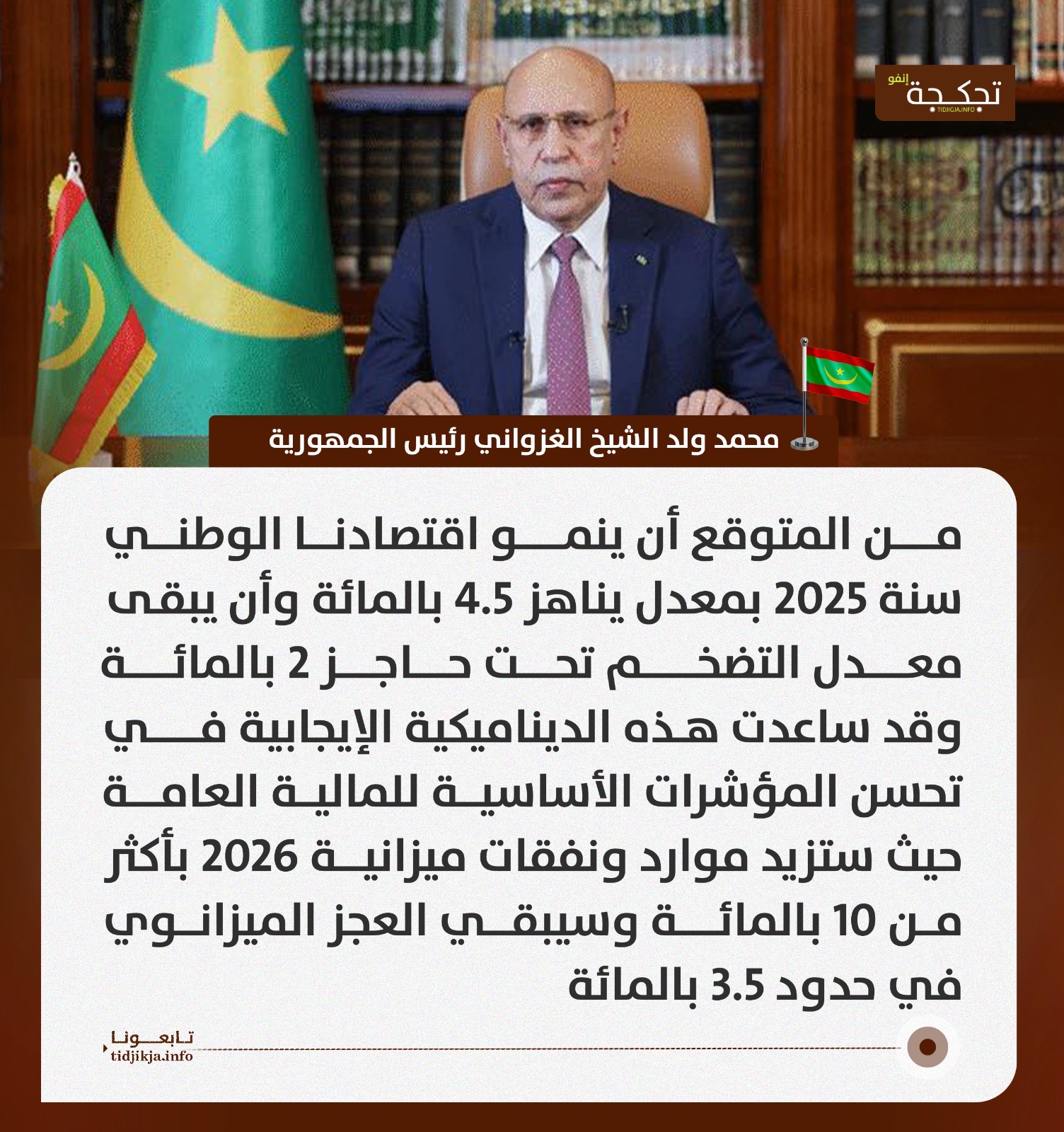 قال الرئيس محمد ولد الشيخ الغزواني إن الاقتصاد الوطني يتوقع أن يحقق خلال سنة 2025 نمواً يناهز 4.5 بالمائة، مع بقاء معدل التضخم تحت حاجز 2 بالمائة ما يعكس ديناميكية إيجابية على المستوى الاقتصادي.