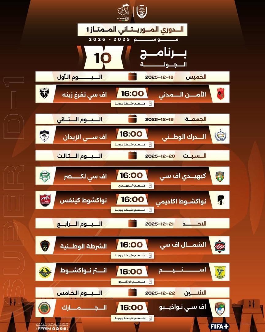 يقص ناديا الأمن المدني وتفرغ زينه شريط الجولة العاشرة من الدوري الوطني، مساء اليوم الخميس، في لقاء يقام على ملعب شيخا ولد بيديا.